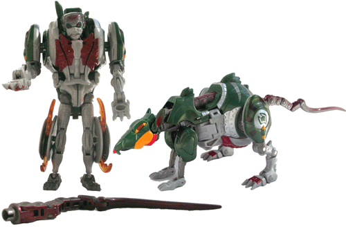 Fairly complex and unusual in many aspects, so the transformation isn't easy to describe. The underside opens up to reveal the robot legs, which fold out while the forelegs and rat head stow away. The hindlegs become the arms while the head, which was the back of the belly (use your imagination!) simply turns around to reveal the face. The tail becomes a whip weapon.