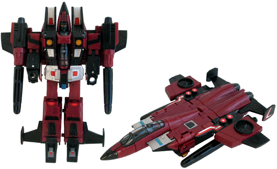 A maroon and black robot with the wings behind his shoulders - again as wings. Thrust has a black face with gold eyes, a silver groin and some red painted details here and there, on a complex paint job. Most of the Classics seekers have been taking cues from the G1 cartoon in robot mode, however Thrust is closer to the G1 toy. His face is black, like Dirge and Ramjet (and the G1 toy), whereas it was light silver in the cartoon. The missiles are black rather than maroon (which suits neither the toy or cartoon), and their shape really stands out now. The black air intakes are now on his shoulders with silver insides, the canopy is integrated into his chest, as on the original. While he represents the greatest divergence from G1 of the four BotCon seekers, this is still clearly Thrust - and he's closer to G1 than Starscream. The colours are good here, the maroon and black are well complimented with silver and red.