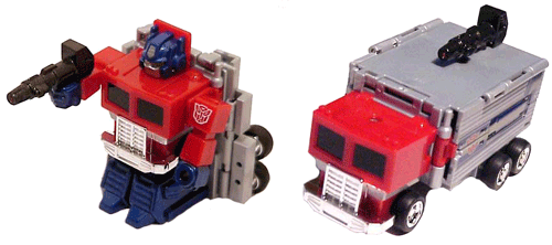 This a pretty decent - if superdeformed - vehicle mode. It's stripped down, granted, but this makes for a cute little Optimus Prime. Both the pullback motor and the attaching weapon work really well here, so not only is he cute but he's fun.