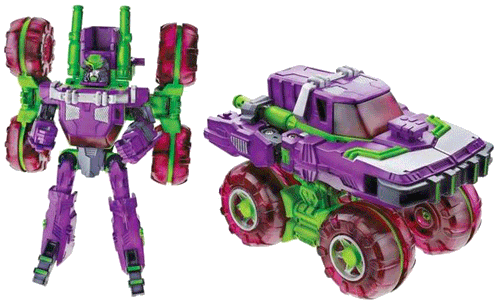 The big, visible backpack is a feature rather than kibble, and along with the exhaust-cannons and roof on his chest, create a robot mode with nice truck elements. He's actually a visually attractive robot, which is amazing for a toy based on bright purple and green.