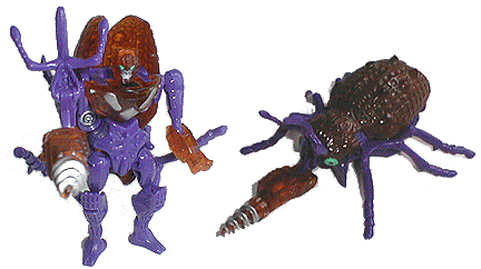 A transparent brown beetle with Decepticon purple on his legs and horn, Drill Bit has green eyes with red pupils and a brown drill sticking out from under his horn with a very non-organic silver on it's thread. The rest of the moulding is very organic, and he has a finely applied brown paint in the recesses of thorax and abdomen, which is easy to miss, meaning he's only partly transparent. It's a nice touch, even if it doesn't really have much point. While the brown paint is nice, I'm not sold on the use of Decepticon purple. While it's not a bad colour in itself, it looks on an organic alt mode.