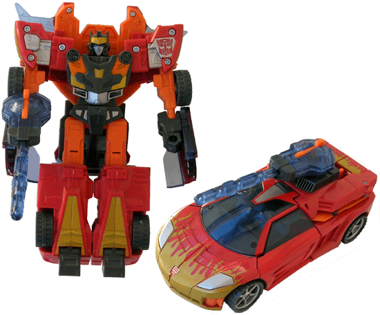 Like Hot Shot before him, Excellion feels like the designer wasn't really trying. The robot arms are the only _bad_ feature here, but the poor paint job on car mode holds him back. Neither mode is very ambitious, the transformation is little more than that of Hot Rod. His Planet Key doesn't really do anything - the fins should be part of the transformation. The missile launcher is not at all integrated in vehicle mode, which is a disappointment alongside the rest of this line. While he's not a bad toy, there's just a malaise in the designing of this toy, and a lack of effort in the repaint. He's neither better nor worse that Hot Shot - I wouldn't recommend getting both - 4.5/10