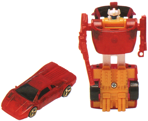 A transparent red sports car, Firecracker is very similar to Gobot Optimus Prime, who is a solid red. Both have black windows, plastic black tyres and gold painted hubcaps. Firecracker has yellow tailpipes on the back, but aside from the mufflers, wheels and windows, he's completely red. The transparent plastic is thick enough that it has a smokey feel to it, so rather than clearly seeing the details underneath, you see shadows of them. It works quite well, although it's very unrealistic (which probably goes without saying).