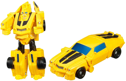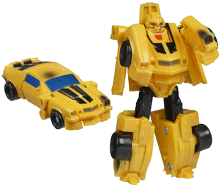 Simplified compared to the deluxe, Bumblebee's transformation reminds me of G1 (specifically, the Hot Rod Patrol). Extend and split the rear to form his legs, fold down the front and detach the fenders to form arms, while the hood itself folds down as a chestplate, revealing his head. The doors sort of hang off the back of his shoulders.