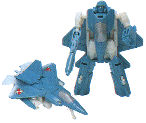 Guess what? He's mainly blue again, although now the white plastic comes into its own on his thighs and shoulders, as well as the landing gear on his shins. He has a bucket-head, which is the same blue as the rest of the toy - an unusual feature for the small Machine Wars toys who often had random head colours. The eyes are made of the same silver plastic as the canopy now on his chest and there are no visible stickers. While the colour scheme is again quite simple, at least the paint wash is no longer visible. The blue head with an unpainted face makes him look like a clone - I have to wonder if Hasbro mixed up the names somewhere along the line.