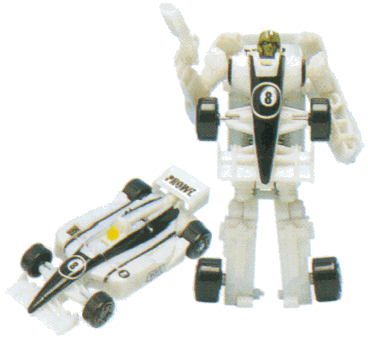 A milky white formula one racer with a black central stripe and two smaller parallel stipes on the sides, Prowl's cockpit section is again white inside the central stripe. He has black tyres and unpainted hubcaps - which is lazy but works well in this colour scheme. This _is_ the Prowl of G1, despite the change of vehicle mode. Prowl sports a number 8 sticker on his nose, which is done as an 8-ball. While it's a weird way of going about it, it looks pretty good visually and fits in with the colour scheme. He has some random advertisers' decals on the sides, all dark colours. None of them really add much, but are dark enough that they don't ruin the illusion. While the colours aren't quite those of Prowl, they're close enough, and work quite well. And just in case you didn't work out that it's Prowl, his name is written on the spoiler in black.