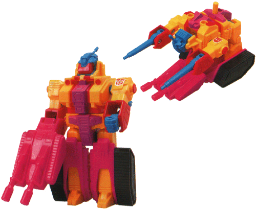 Omega Spreem is pretty much a robot hunched over to form a tank. The two side cannons are quite obviously on the ends of his arms and the centre one is on the back of his head - which _is_ taken from Omega Supreme. The rear treads are painted black while the front treads are magenta. There are no wheels. The robot thighs connect the upper half of the toy with the treads at the back (his knees, basically).
