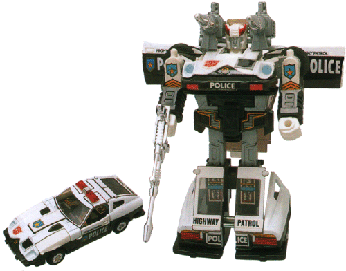 If you're keen, you'll notice he has Targa top lines on his roof, under the strobe rack - which are on the mould for Bluestreak's benefit. Basically, this strobe rack is the only mould difference between the two. Anyway, so he's got a Targa top painted over, but it's subtle and easy to miss. On his hood he has air intakes with are painted black, as well as a blue police badge symbol with the word "Diaclone" and a star. He also has this badge on the door, next to the word "POLICE" in white, above these on the white section are the words "HIGHWAY PATROL". He also has "HIGHWAY PATROL" just below the rear window.