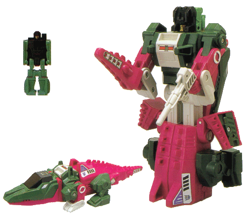 Remove the tailtip and set aside, release Grax from his cockpit and transform into head mode. Flip out the sides of his tailstub, flip out the base of the tail to form his boots, which will reveal the thighs and groin. Rotate the waist, fold the alligator head onto his back, revealing his Headmaster socket - into which you'll attach Grax. The forelegs unfold into the robot arms, while the feet flip back and hang off the back of his wrists. Give Skullcruncher his gun, and his tailtip as a sort of serrated-sword. You can stow this sword in his backpack if you prefer.