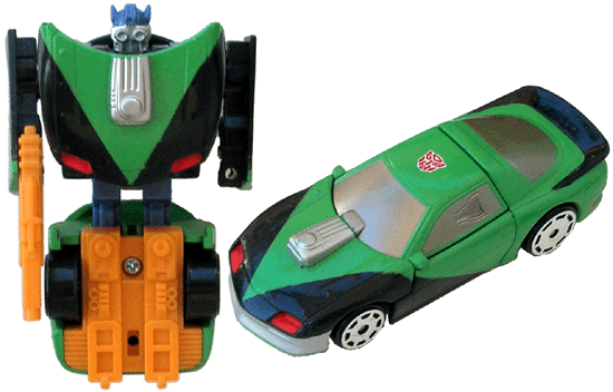 A green & black drag racer, although it's a production model style - so it ends up looking more like a NASCAR type of vehicle. The parachute backs on the back give him away as a Drag racer though. He also has rivets on his hood, which is a rather nice bit of detailing. He's got silver hubcaps, a silver engine popping through the hood, a silver front bumper and champagne gold windows. Both Tail & headlights are red - the headlights look pretty stupid in red, too. There's an Autobot symbol on the roof.