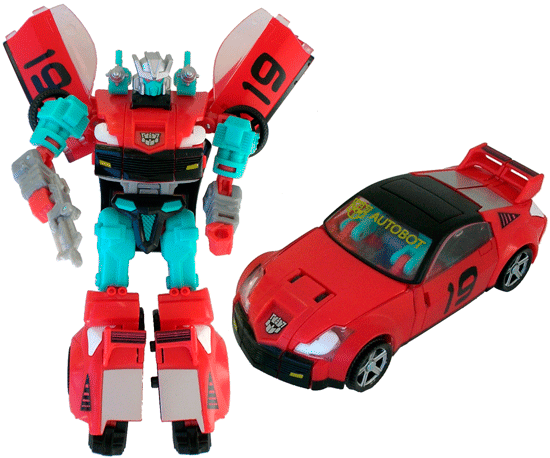 A red sports car with black painted hood and roof and silver on his rear windows, Rapido is a repaint of Universe 2.0 Bluestreak based on Rapido. The read and tailights are while while the front bumper is black and there's a prominent yellow G2 Autobot logo on his windshield along with "AUTOBOT" in yellow lettering. Rapido has a silver & black G2 Autobot logo on his hood and the number "19" on his doors as on the original. The silver rear window is a subtle nod to the silver engineblock behind the cabin on the original toy.