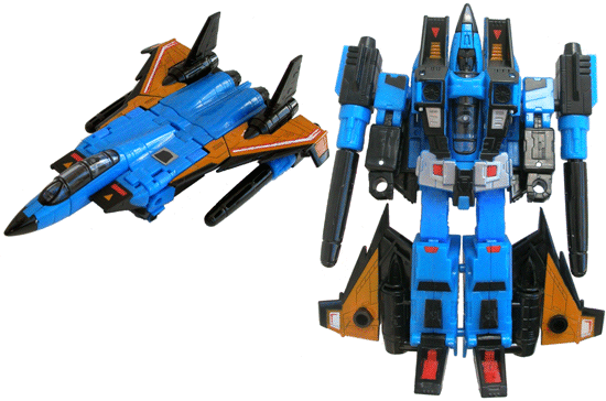 While it's simple in many ways, this is a solid robot mode without any significant flaws. The poseability is good, with the tailfins on the back doing a good job as heelspurs. The weapons are very nice, the conehead actually looks good and the G1 tribute is superb. Other than the silver groin, this is a perfect tribute.