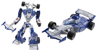 Unclip the airdam and set aside. Lift the rear, pull out to form the legs, split the legs and fold up the spoiler to form feet. Swing the sides out to form his arms, rotate the waist. Fold down the shoulderblades, swing the nose down to form his chest and reveal his head. Unfold the arms and swing out his fists, give him the airdam as a handheld weapon.