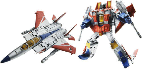 Detach the missile launchers, extend the rear to form the boots. Fold up the tailwings and rotate the tailfins forward to form heelspurs. Fold down the feet and stow away the front wheels. Stand him up, swivel the wings up. Fold out the chestplate, rotate the canopy and pivot down to form the centre of his chest, rotate the nose and fold back to reveal his head. Flip out the arms and fold the chestplate back into position. Flip out his fists, give Starscream his weapons, either on the upper arms as traditional null rays or as handheld missile launchers.