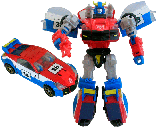 A red and blue racing car similar to the original Smokescreen, with red on top and blue around the bottom and white stripes along the sides. His tyres are black plastic with gold painted hubcaps while there's a black on white "38" on both doors and his hood. The front and side windows are colourless plastic while the rear windows are painted black. The spoiler is blue with odd yellow painted areas on top while the taillights are transparent yellow and the headlights composed of the same colourless plastic as the windows. There's a red painted patch at the front which sports a stamped Autobot logo. This patch is a distinctly different shade of red compared to the rest of the toy. While I'm not keen on this different shade of red, I'm less than impressed with the choice of yellow on his spoiler and taillights - the involved colours of Smokescreen really don't need random yellow - especially when red taillights would have made more sense. While this colour scheme is broadly faithful to the original, the end result feels quite cheap and sloppy.