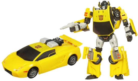 The Japanese version (which I have) features a more traditional cadmium yellow along with silver chrome on his engineblock, spoiler and gun. The yellow shades on this version are a better match, also. BotCon 2010 Breakdown also uses this mould (with a different head). Henkei Alert & Generations Red Alert are retools of Sunstreaker.