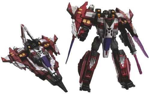 This is a repaint of the Galaxy Force version of Starscream, which I've already mentioned. There are also Supreme and Legends size Starscreams in Cybertron - both share the GF version's colour scheme. This particular toy comes exclusively with Vector Prime as a TRU exclusive. TFU Dirge is a repaint of Starscream (in another two pack!).