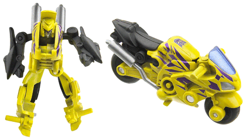 A lemon yellow racing motorbike with a black saddle, purple flame-like painted details on the sides, a metallic cobalt blue windshield (metallic paint, not plastic) and silver headlights and tailpipes. The tyres are black plastic and Dirt Rocket sports a Decepticon logo stamped on his fueltank, which faces backwards. While lemon yellow might seem odd for a motorbike, this colour scheme works well enough since the yellow contrasts with purple and black well. The painted details are quite thoughtful - the headlights work well and the exhaust pipe paint extends to the pipes heading back into the engine (a really nice touch).