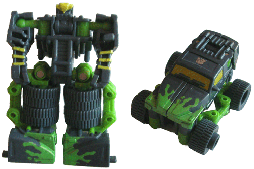 Probably the most ambitious of the tree members of this set - and a definite improvement over Blastcharge as far as the legs are concerned. The colours work well in truck mode, not so well in robot mode. Overall I do think the design is clever enough to work, and while he's not as successful as Oil Slick, Grindor is still worthwhile - 6/10