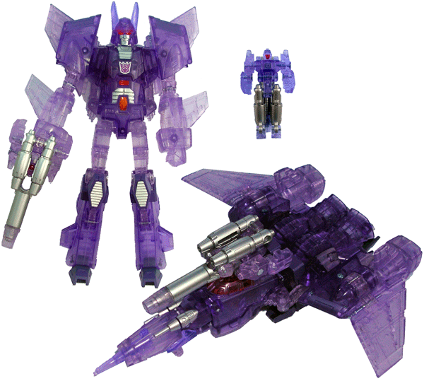 A transparent purple jet, he's a repaint of Universe/Henkei Cyclonus, which is also purple. The shape is similar to the original. There are actually two shades of transparent purple here - the wings, engines & nose are a slightly lighter shade of plastic. There are transparent red windows on the cockpit and some silver detailing on the nose, but really Cyclonus is all about transparent purple here. There are no Decepticon logos visible here, just as on the regular version. While there's no doubt that this is meant to be Cyclonus - the purple cements this fact - the colour scheme is rather boring.