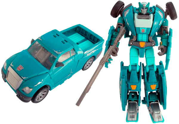 A nice pick-up truck that takes the concept of Kup's vehicle mode and makes it realistic, while still retaining the feel of the character. The retro feel is subtle but gives an "elderly" hint which helps in this respect. It's a fairly straightforward vehicle mode but with clever understated play value. The repaint is fairly trivial, really - the battle damage paint adds to that elderly feel, but the overall feel is similar to the standard versions all the same.