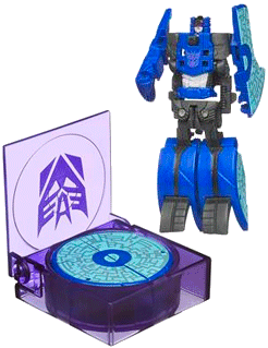 There's some play value here. He can be stored inside the transparent purple casing he comes packaged with or stowed inside Soundwave or Soundblaster's chest. The idea is that Soundwave can fire the disc out and your data disc will auto-transform. It works reasonably well with this figure, too.