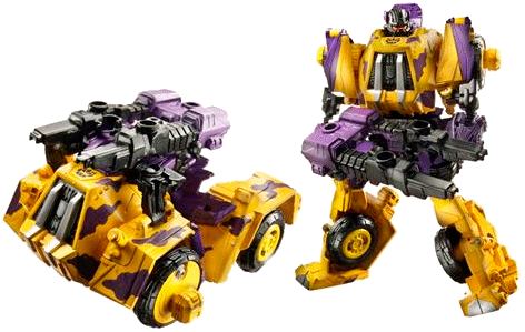 A yellow robot with purple thighs & forearms, a purple head with fluorescent red eyes & some purple camouflage on his chest. Onslaught has black elbows & hands, some black & silver on his torso & a purple groin. The colour scheme is similar to (and in some ways better than) that of G2 Onslaught; and overall this is a pretty nice colour map. There's a black G2 Decepticon logo stamped on his chest right below the head, which is also visible on the vehicle mode (it's above the window).