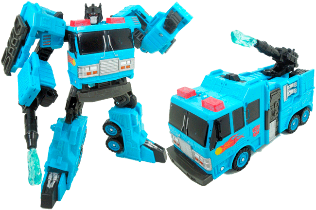 A baby blue modern fire truck with a dark grey front & mid panels. Hot Spot has red & orange stylised fireballs on the doors similar to the decals on his original toy. Hot Spot has black painted windows and transparent pink strobes on his roof. The front grille area and some hose details on the sides are painted silver while the headlights are painted white and orange. His tyres are black while the wheels are painted baby blue. There's large black silver water cannon on top with a transparent blue jetstream (it looks suspiciously like a missile!) and red Autobot logos stamped on either side behind the doors. It's a simple yet detailed colour scheme which matches his G1 toy nicely; and it's a natural choice for this mould (which was designed for Inferno); he really doesn't feel like a repaint & instead just feels like an update of Hot Spot here.