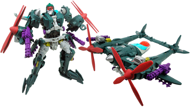 A dark army green twin boom propellor aircraft, similar to the Lockheed P-38 Lightning. Powerdive is a repaint of ROTF Highbrow, who is also green albeit a lighter shade. Powerdive has a central cockpit between the two booms, hanging off the wing at the front. The two propellors are brick red while the gatling guns & missile racks on the wings are purple. The area around the cockpit is painted mint green with a snarling grey shark's head on either side while the canopy is transparent red with a seat inside. There are silver painted engines behind either prop with gold exhausts & silver Decepticon logos on the tailwings. While some of the details (the purple weapons & red rotors) aren't terribly realistic, the green itself is realistic enough. The details are duller matches to colours found on G2 Powerdive. The duller colours are a G1 (well, Generations) take on his original colours, and I actually appreciate the changes as while this still feels like Powerdive he can hold his own alongside other toys in this line (the G1 style Decepticon symbols help).