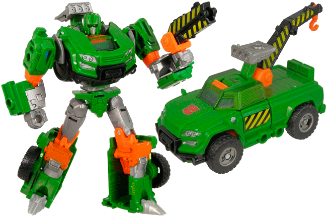 Detach and set aside the towing arm. Split the rear and pivot the halves out to the sides and back to form his legs. Fold down the doors, swing the arms out to the sides. Push in the Autobot logo on the hood, fold down the front to form his chest. Rotate the shoulders up & clip them onto his side mirrors. Rotate the forearms & fold out his fists. Flip out and rotate his head. fold down the feet & stand him up. Fold the towing arm up (with hook concealed inside) as a gun and place in either hand.