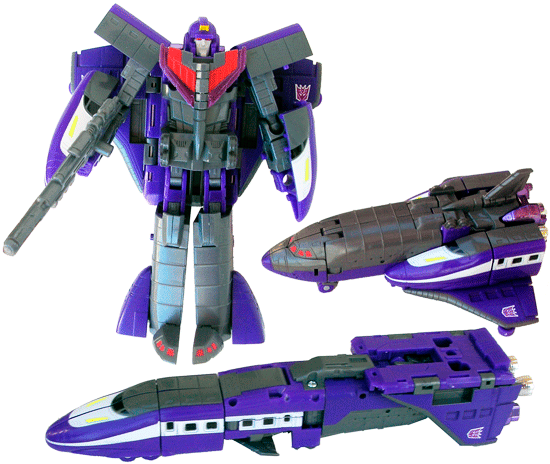 The poseability is a vast improvement on G1, which I guess is to be expected. The head turns, the shoulders and elbows are ball jointed while the shoulderpads can tilt up and down. Both the knees are hips are hinged with rotators while the feet can swing down and the heelspurs swing up _and_ down. The heelspurs are clever- they're actually the stowable front wheels of the shuttle, making double use of the hinge. The backplate (which holds the wings) does get in the way of a few poses but generally the poseability here is good - and easily better than G1 Astrotrain's (one of the first Transformers to feature ball joints, actually). The gun is a long grey affair, fundamentally similar to its 1985 equivalent. The post for attachment to shuttle mode sits on one side, as a result it works better in his right hand than left - though he can hold the gun in either hand.