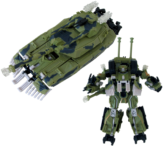 A large green robot with black treads on his shoulders, black feet and black claw-hands. His face has some silver painted details and red eyes, while there's grey on his chest and knees. Brawl has a few gold painted details here and there and those cheesy transparent guns behind the arms. The colour scheme is better now - even the colourless stuff can work on the robot mode. There's more black but hardly any camouflage - much of it is folded up on the panels behind his boots. The colour scheme works well and the sculpt is good enough to befit a toy of this scale.