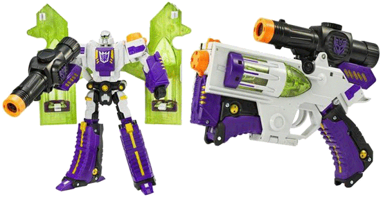 Having bagged the idea, I have to concede that this Megatron gun is quite well executed for what it is. He can't fire anything (another legal thing) but the trigger clicks when you pull it, you can look through the scope, which has a crosshairs on its yellow window. The gun itself holds together very well, and while there are a few robot mode hints here and there, none of them are glaringly bad. There are moulded Decepticon logos on either side of the stock, painted purple, which look pretty good. The handle is one of his legs, but looks like a handle, which is nice.