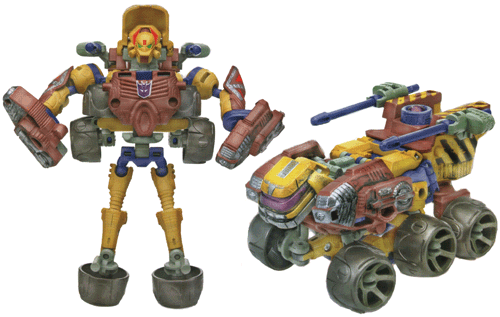Complex and clever for a deluxe. The legs fold out from underneath and the front fenders become the arms. The cockpit lifts up and reveals her head, the missile launchers end up on the shoulders. The front set of wheels become her feet, the central set slot into her waist and the rear set fold underneath her back. The transformation back to vehicle mode has to be done right or she wont fit together properly, but is otherwise easy since she essentially folds up.