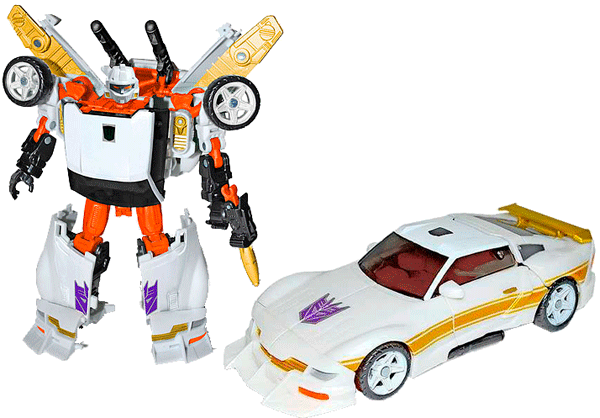 A white robot with orange thighs, black forearms and gold wings. His face is silver with a white mouth plate & red eyes. The gun is black with gold painted at the front and he sports two black shoulder cannons. There's a lot of orange plastic visible, most of which is internal connecting bits - not unlike the pullback mechanism on the Battlecharger version. The rubsign is now centre on his chest while the purple Decepticon logo is split on his shins. The gold wings allude to the gold arms seen in the G1 media (which wouldn't have worked on the arms here as it would have rubbed off while transforming. The gold and orange highlights really nail this colour scheme as Runamuck and the resculpted head fits as well.