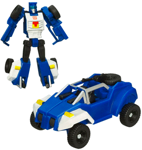 A small blue dune buggy with white front fenders, a silver rollcage and black tyres. Beachcomber's colours are similar to those on the G1 Minibot which he is tributing, albeit without the grey found on that toy. The tyres are plastic rather than rubber as on the G1 toy, and this version has a black spare tyre on the back, along with a black gun. There are black seats inside the open cockpit and yellow headlights on the fenders, rounding out a fairly simple colour scheme which is not underdone (as is the case with many Legends). The tribute isn't quite as strong as it could be, but works very well nonetheless.