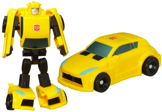 A yellow hatchback with black tyres and metallic blue windows, Bumblebee is a hatchback but is distinctly not a VW Beetle due to licensing issues. Despite this, he is a representation of G1 Bumblebee. The headlights are sky blue while there's a red stamped Autobot logo on his roof. The colour scheme is simple yet effective, as on the original toy.