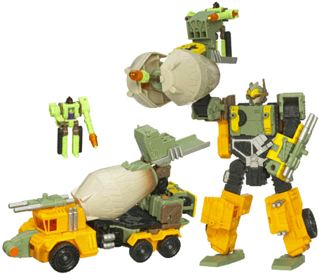 A good set with well thought out play value. The key gimmick is much more rewarding than yet another sound gimmick - and still allows the toy to transform and pose without having to lug around a large block. The colours are okay, and while I prefer those of Quickmix, there's nothing _wrong_ with the colours here - Heavy Load is dull, which is surprising for a repaint, and a little less interesting. The detailing on Heavy Load is impressive and really adds to the toy. The set integrates better than most Armada sets did, making the addition of a Minicon (unusual in for a Cybertron mould) a definite plus for Heavy Load. While his poseability is a little limited, overall Heavy Load's play value is good, and offers something different. While I wouldn't recommend both him & Quickmix (since they're both fairly pricey toys), I'd recommend Heavy Load if you missed Quickmix (or prefer these colours) - 8.5/10