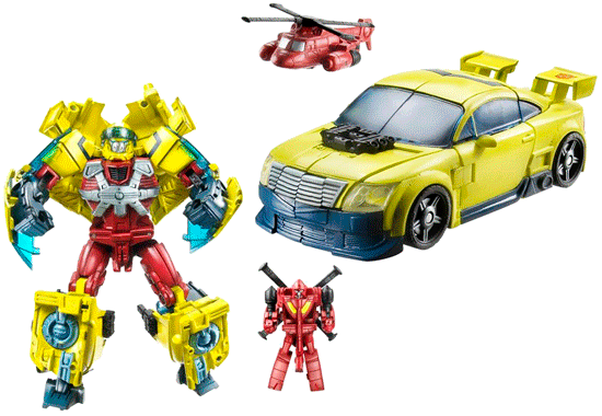 A mixed result here. While the original Hot Shot was a fairly limited toy, it was one of Armada's better concepts. The articulation has been improved but the backpack gets in the way and Hot Shot cries out for those Henkei weapons. The colours are a distinct improvement and the lightpipe is nice. Jolt is all but useless - a distinct regression on the original that adds almost nothing to Hot Shot (he adds completeness to the vehicle mode, but doesn't secure well). The vehicle mode is his stronger mode, but the JaAm reference plays a big role in that (and it shouldn't). While it's not an awful set, Jolt is poor and Hot Shot fixes the problems of the Armada toy only to create new ones. I appreciate that Universe 2.0 delved outside of G1 for its tributes, but I think the very limited Scavenger would have been a better choice - 6/10