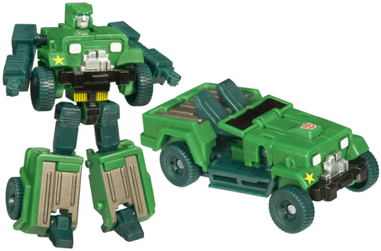 A good Jeep mode overall, but one that's needlessly held back by the stupid decision to use pine green plastic instead of black. Aside from the fact that green tyres aren't a good idea, the pine serves to highlight the fact that the body of the toy is not army green - which wouldn't have been an issue against black. The paint job and sculpt are both good, which saves Hound from the poor plastic choice, but it's still frustrating that his main flaw was so avoidable.
