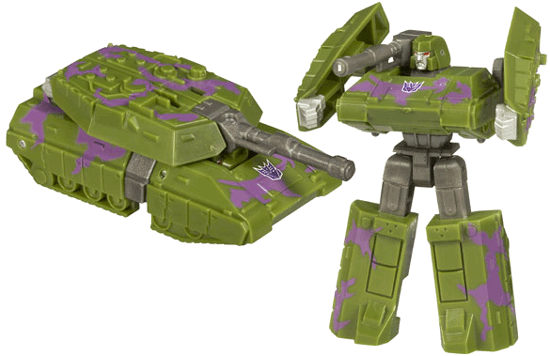 A small dull green tank with camouflage patches in a fairly purple, Megatron is a tribute to G2 Megatron without the eye-damaging bright colours so characteristic of that line. The barrel is grey while there's a stamped Decepticon logo on the front of the tank. Essentially this is a more realistic interpretation of that concept, and it works surprisingly well, in an understated way.